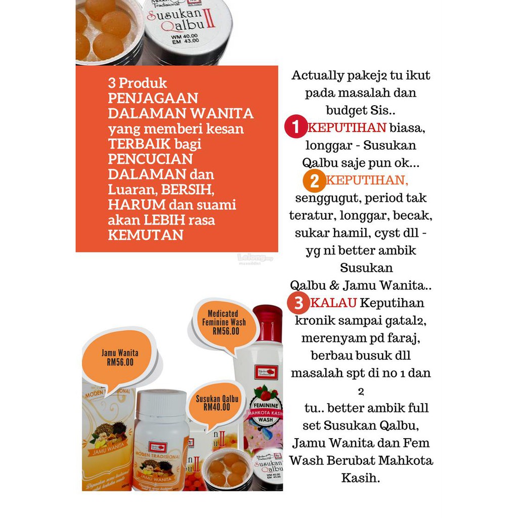 Khas untuk merawat keputihan dan period tak teratur menghilangkan bau badan mempunyai 30 tablet (tahan 1 bulan) 100% dibuat dari bahan semulajadi.
