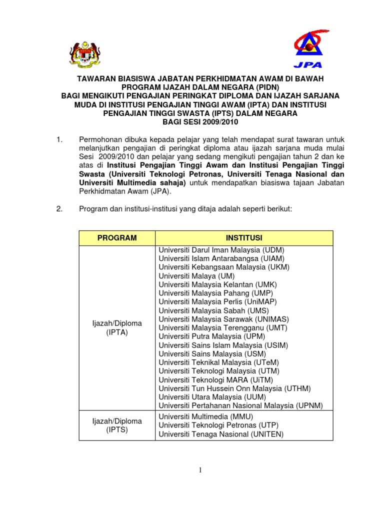 Biasiswa jabatan perkhidmatan awam (jpa) objektif biasiswa jpa adalah melahir dan membangun modal insan terbaik serta kompeten untuk memenuhi keperluan strategik perkhidmatan awam dan negara melalui dasar latihan dan program penajaan yang dinamik. Permohonan ini dibuka mulai 9 mac 2020 sehingga tarikh 18 mac 2020. Permohonan biasiswa jabatan perkhidmatan awam di bawah program ijazah dalam negara (pidn) bagi mengikuti pengajian peringkat diploma dan ijazah sarjana muda di institusi pengajian tinggi awam (ipta) dan institusi pengajian tinggi swasta (ipts) dalam negara bagi sesi 2021/ 2022 akan dibuka mulai jam 5.00 petang, 11 mac 2021 (khamis) sehingga 23. Memantau prestasi akademik dan hal. Jabatan perkhidmatan awam aras 3, blok c2, kompleks c, pusat pentadbiran kerajaan persekutuan, 62510 putrajaya.